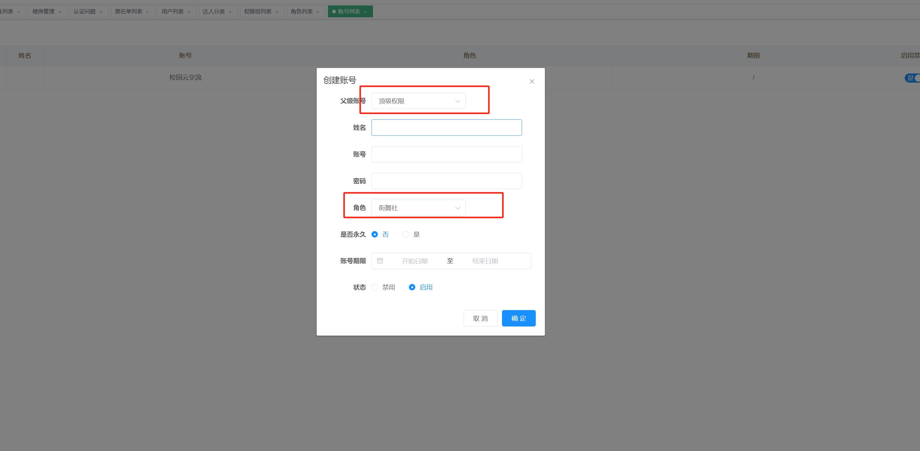 - 权限我们默认给他顶级权限就行(当账号多了,此处可以给他分配上级账号)上级账号可以看到下级创建的DIY内容